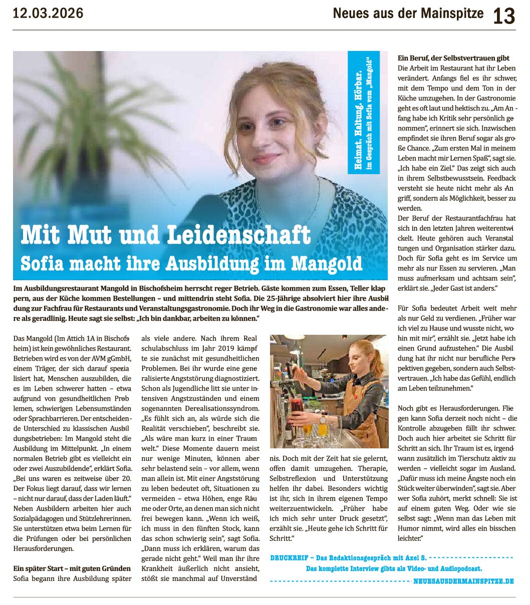 Mit Mut und Leidenschaft 23. März 2026 Beitrag im Magazin Neues aus der Mainspitze vom 12. März 2026 zur Ausbildung in unserem AUsbildungsrestaurant DAS MANGOLD.